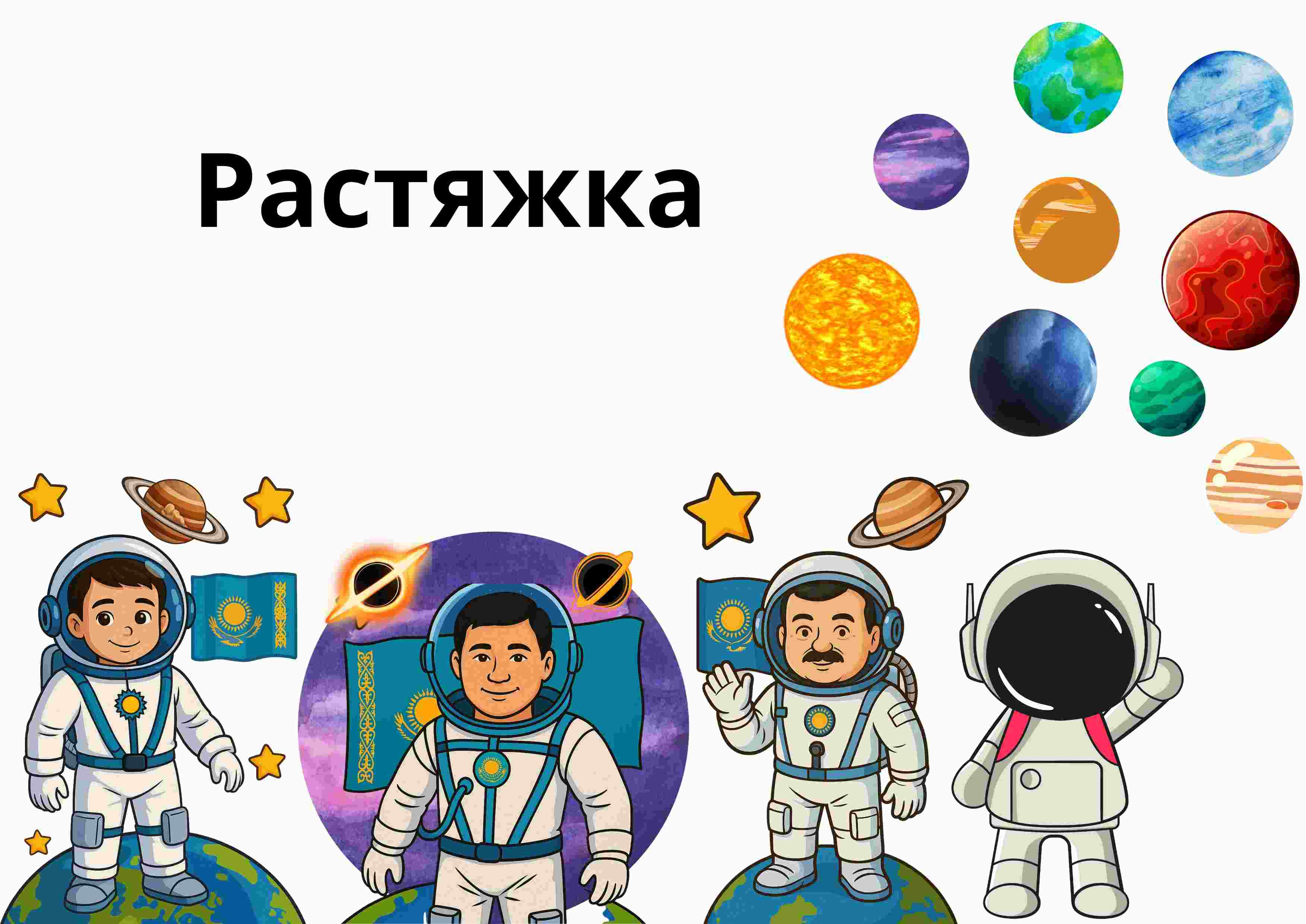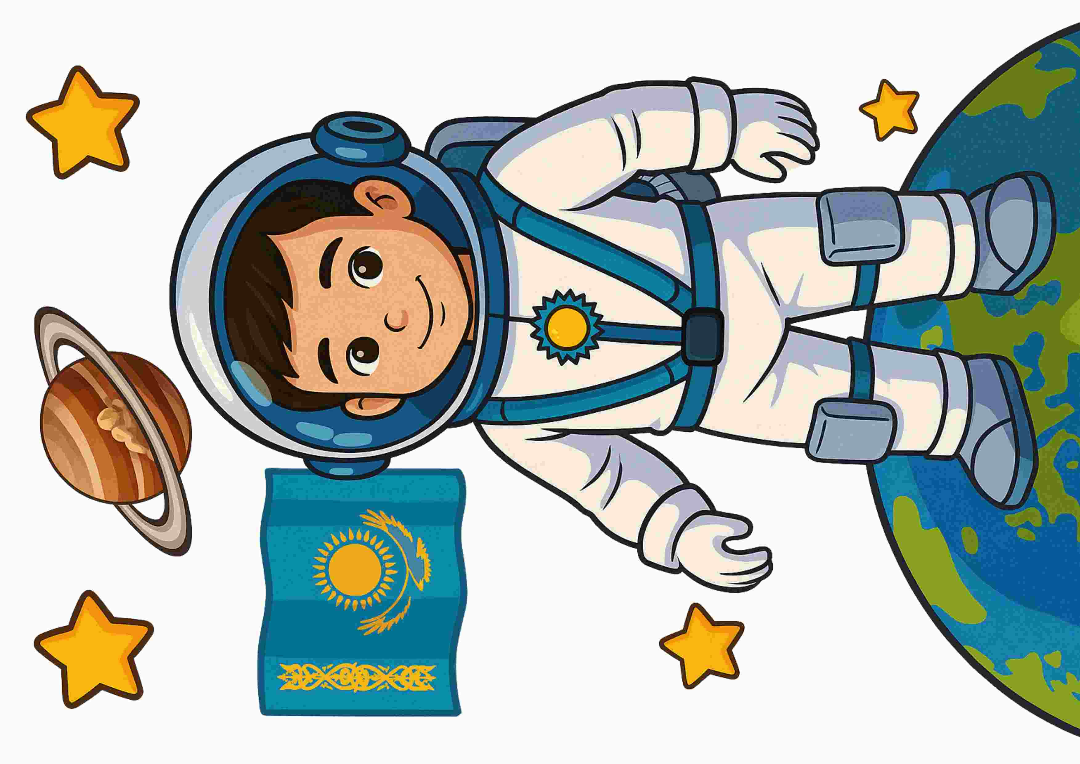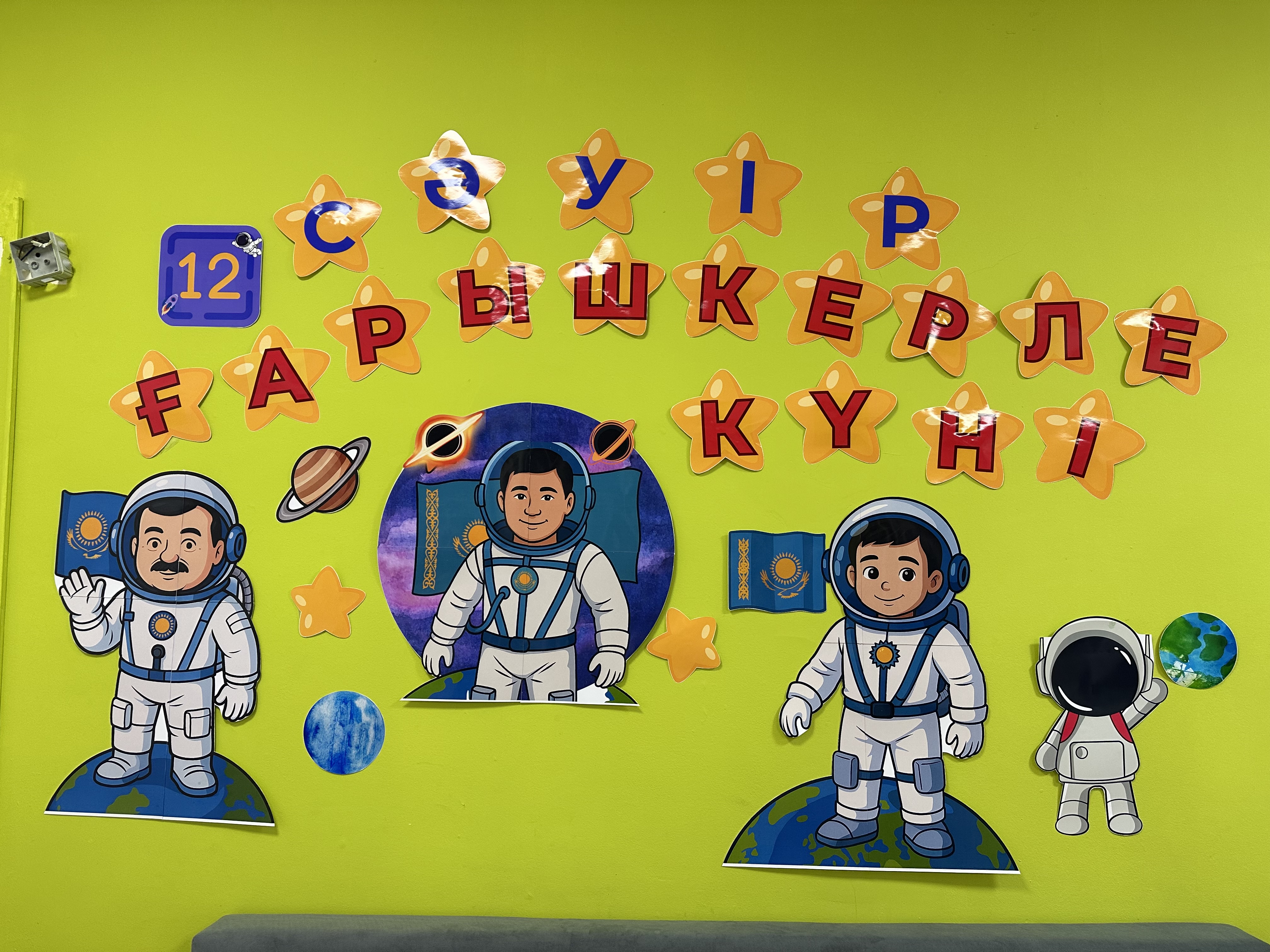 Безендіруде «Ғарышкерлер күні» жазуы жұлдыз пішінінде берілген әріптермен безендіріліп, балаларға ерекше көңіл-күй сыйлайды. Сонымен қатар, ғарышкерлердің суреттері, планеталар және Қазақстан туы элементтері қосылып, тақырып толық ашылған.