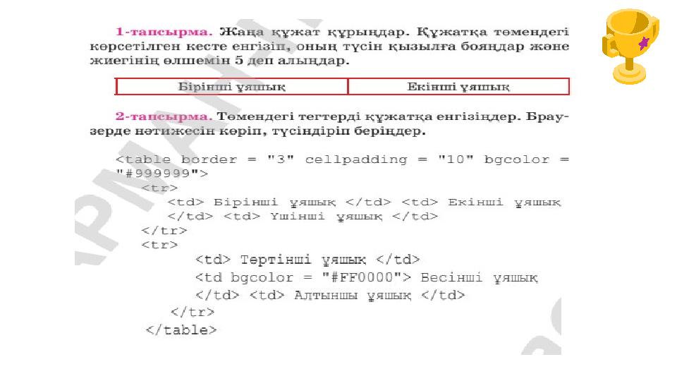 Кесте құру үшін <TABLE> және </TABLE> тегтерін қолдпнылатынын білесіңдер. Мысалы: <table> <tr> <td> бірінші ұяшық </tr> <td> Екінші ұяшық </td> <tr> </table> Бірінші ұяшық Екінші ұяшық Мұнда кесте жиегі болмайды. Кесте жиегі көріну үшін алдынғы бөлімде өткен «border» атырибуты қолданылады. <table border=“1”> <tr> <td> Бірінші ұяшық </td> <td> Екінші ұяшық </td> </tr> </table> Web – беттерінде төмендегідей көрінеді. Бірінші ұяшық Екінші ұяшық