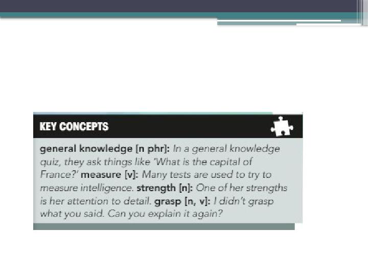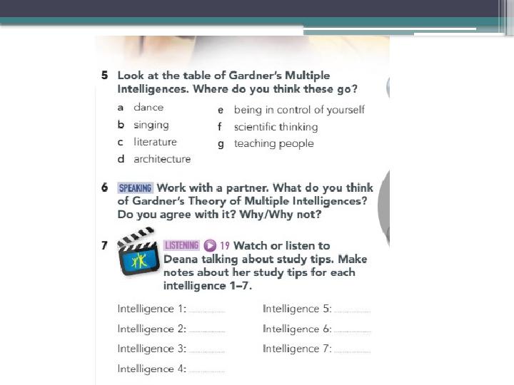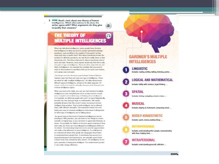 •spatial [adj]: related to space, size or position of things kinaesthetic [adj]: the use interpersonal [adj]: about relationships between people clarify [v]: make clear and comprehensible intrapersonal [adj]: happening or existing within the mind