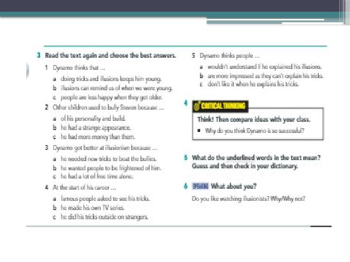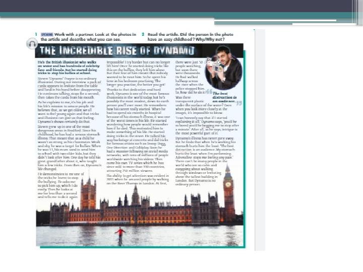 Lesson objectives •All learners will be able to: •- describe the photographs •- apply the rules for comparative and superlative adverbs •Most learners will be able to: •- read the text for general and specific information •- rewrite the sentences using the correct comparative and superlative forms •Some learners will be able to: •- discuss the reasons for Dynamo’s success and plan what skills they could become really good at if they practiced for 10 000 hours •- make dialogues using the relevant expressions and other ways of making comparisons