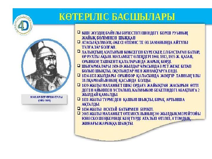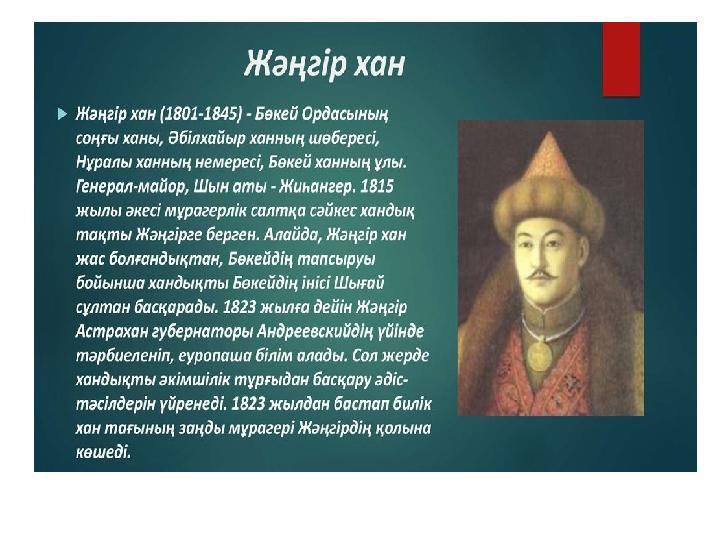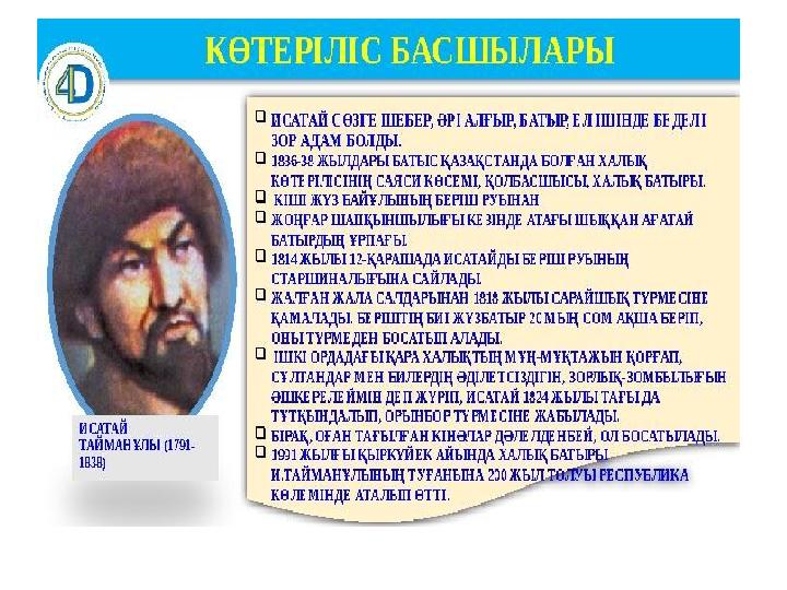 Көтерілістің тарихи маңызы •Исатай Тайманұлы мен Махамбет Өтемісұлы басқарған көтерілістің орасан зор тарихи маңызы болды. •Бұл патша үкіметі құрған жаңа әкімшілік-аумақтық бірліктің аумағында қазақтардың отаршылдыққа қарсы ірі баскөтеруі еді. Оның ұлт-азаттық сипаты басым болды. Көтеріліс аяусыздықпен басылғаннан кейін де жалғаса берді. 1842 жылы Жәңгір ханға қарсы Аббас Кошайұлы мен Лаубай Мантайұлы бастаған баскөтерулер болып өтті. •Жәңгір хан көтерілісшілердің кейбір талаптарын орындауға мәжбүр болды. Атап айтқанда, халықтан жиналатын алым- салық көлемін едәуір жеңілдетті. Патша үкіметіне наразылық білдірген старшындардың пікірімен санасу керектігін түсінді.