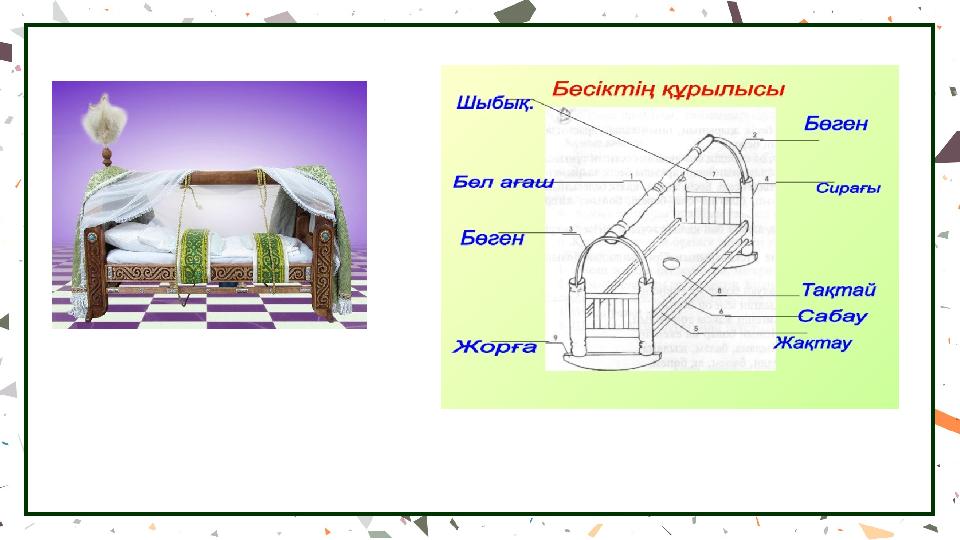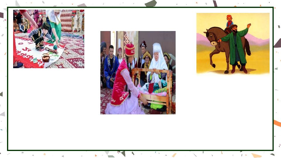Бесікке салатын заттар Қыз бала Ұл бала айна қамшы тарақ Бұркіт тұяғы Қасқыр тісі нан тұмар Үкі