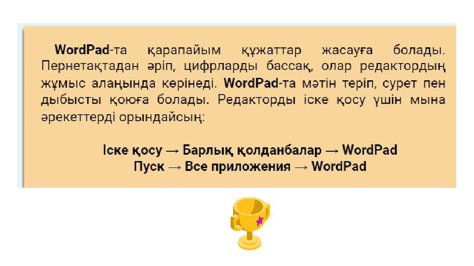 Топтық жұмыс. «Мен, Сен, Ол » әдісі арқылы оқушылар кезекпен тапсырманы бірлесіп орындайды. Тапсырма: оқулықтың 46 беттеріндегі орында тапсырмасын топпен орында Дескриптор: Пернетақта әріптер пернесін біледі;1балл Сиволдарды тіл ауыстырып жаза алады; /1балл WordPad редакторын іске қоса алады;/1балл Ақпаратты сақтау, ашу командаларын біледі;/1 балл Платформамен жұмыс істей алады;/1балл Барлығы /5 балл