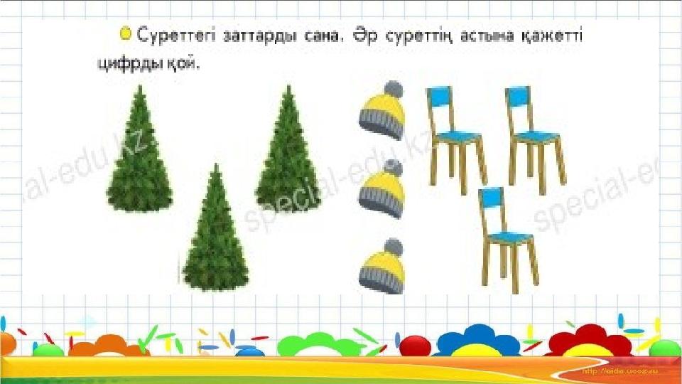 3 санының құрамын түсінеді; 3 саны мен цифрын ажырата алады; Санақ барысында ретімен 1–3 дейін және кері санай алады;