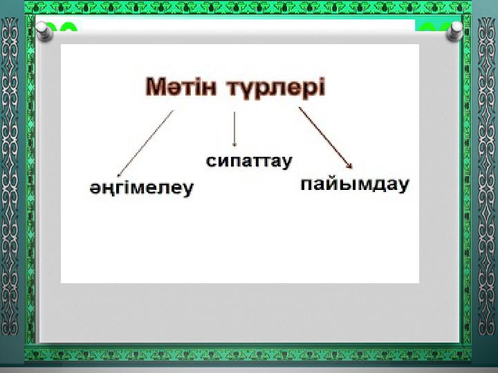 Ер еже: O1.Оқиғаны ретімен баяндайтын мәтін әңгімелеу мәтіні деп аталады. Ол сөйлемдер іс-қимылды білдіреді. Сұрағы: Не істеді? O2.Зат немесе құбылысты суреттеп, сипаттайтын мәтін сипаттау мәтіні деп аталады. Ол сөйлемдер заттың сынын білдіреді. Сұрағы: Қандай? Қалай? O3.Оқиға, құбылыстардың себебін дәлелдейтін мәтін пайымдау мәтіні деп аталады. Сөйлемдер себебін ашып көрсетеді. Сұрағы: Неліктен?