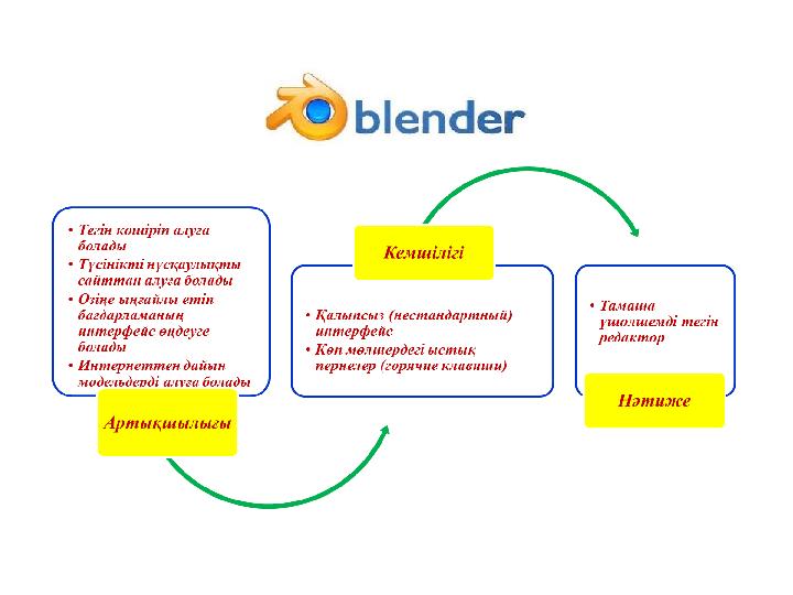 Blender –3D модельдеу компьютерлік графика бағдарламасы. Blender бағдарламасының көмегімен 3D модельдеу, анимация жасауға, видеоүзінділерді өңдеуге,түрлі ойындарға логикалық объектілерді енгізуге мүмкіндік береді. Ең маңыздысы, ол бағдарламаның азғантай көлемі (шамамен 10-20 мегабайт) Blender әр түрлі ОЖ жұмыс істеуге мүмкіндік береді, олар: Linux, Windows, MacOS т.б. Бағдарламаны тегін көшіріп алуға болады GNU лицензиясы бойынша.
