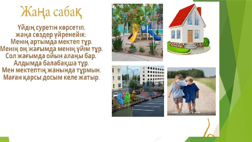 Жаңа сөздер Алдында –спереди Артында –сзади Жанында-рядом,оеоло Қарсы-напротив Жер үй-часный дом
