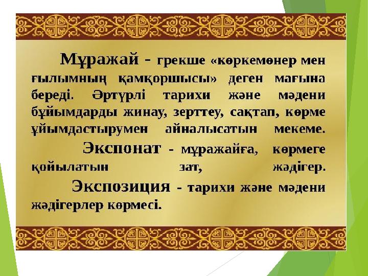 Оқу мақсаттары: 4.3.1.2 тарихи мұражайлардың қызметін түсіндіру 4.3.1.3 мұражайдың өзіндік жобасын ұсыну Сабақ мақсаты: Тарихи мұражайлардың қызметін түсінеді. Мұражайдың өзіндік жобасын ұсынады.