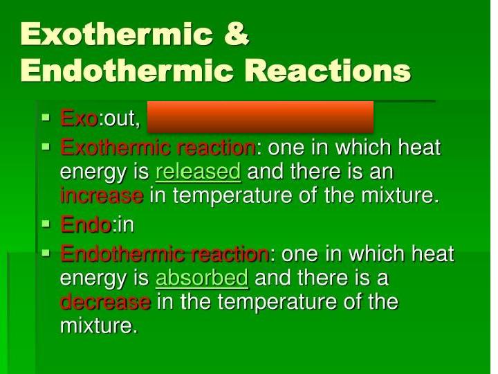 According to energy exchange all chemical reactions are divided into two groups: endothermic and exothermic. The exothermic reactions give out heat (release energy) and the endothermic reaction takes in heat (absorb energy).  The thermite reaction between aluminum and iron oxide: 2AI + Fe 2 O 3 = AI 2 O 3 + 2Fe + 841kj (release energy)  Decomposition of calcium carbonate CaCO 3 is a good example of an endothermic reaction: CaCO 3 = CaO + CO 2 - 169.5kj (absorb energy)Endothermic and exothermic reactions