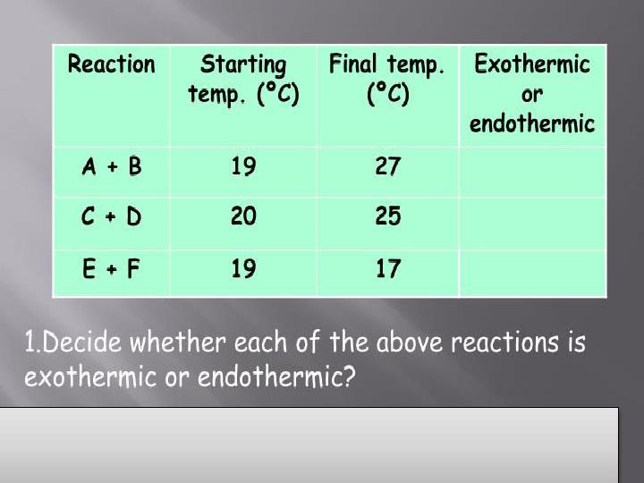 According to energy exchange all chemical reactions are divided into two groups: endothermic and exothermic. The exoth