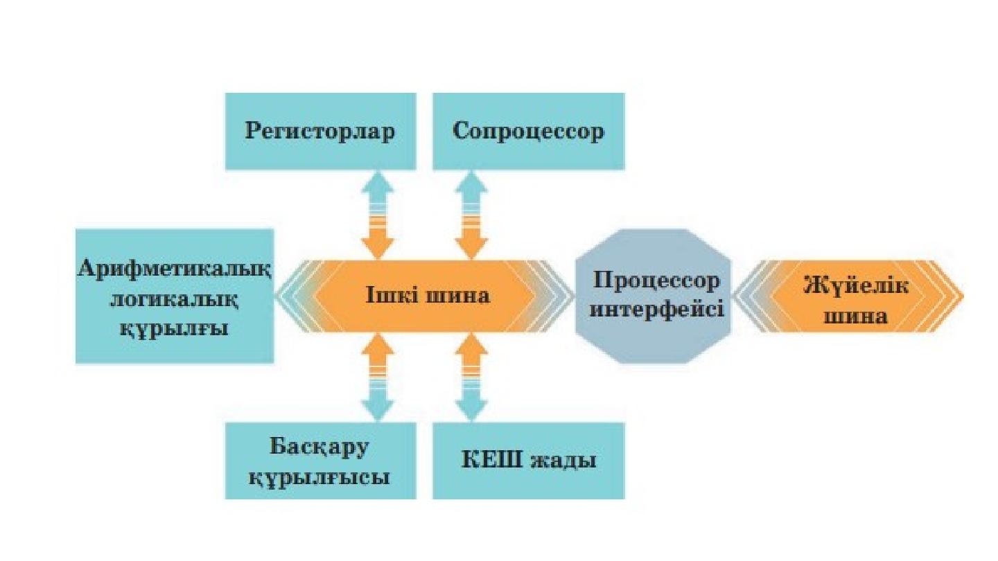Арифметикалық-логикалық құрылғы – барлық математикалық және логикалық операцияларды орындайды. Басқару құрылғысы – процессордың командаларды тізбекпен орындауын қамтамасыз етеді. КЕШ жады – ақпаратты уақытша сақтауға арналған шағын көлемді өте жылдам есте сақтауға арналған құрылғы. КЕШ жадта жедел жадтың ең көп қолданылатын ұяшықтары мен командалары сақталады.