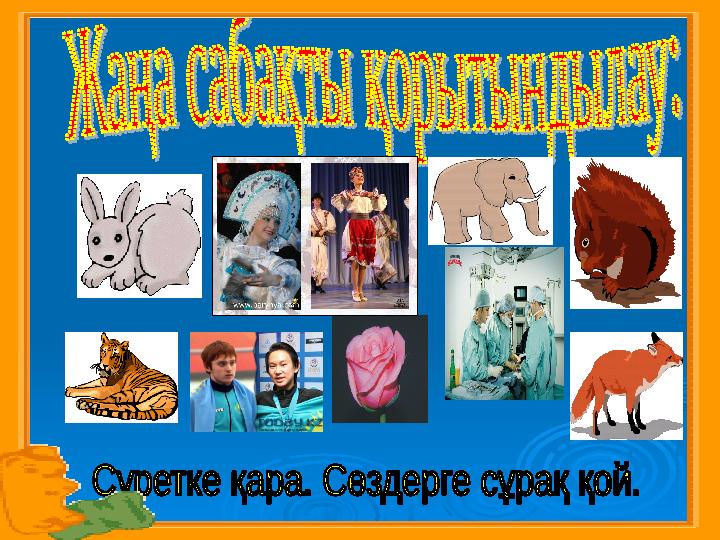 “ Кім білімпаз? ” Ешкінің қандай пайдасы бар? Қойдың пайдасы жайлы әңгімеле. Сиырды не үшін бағамыз? Биенің сүті қалай аталады? Сүттен қандай тағамдар жасалады? Қой сөзімен бірдей айтылатын, бірақ мағынасы басқа сөзді тап.