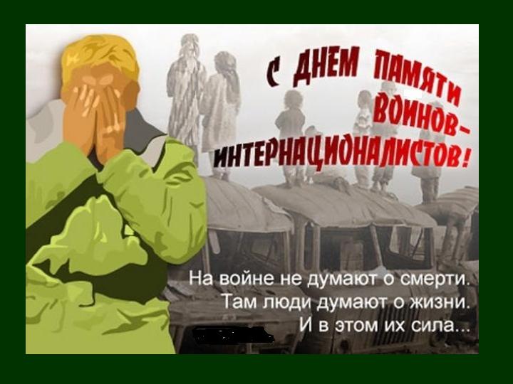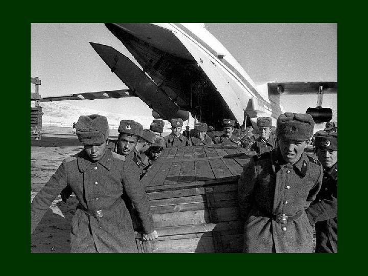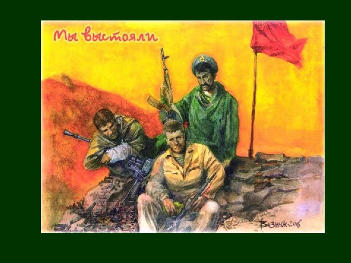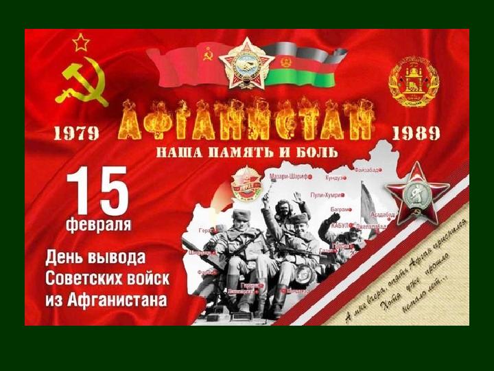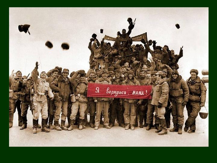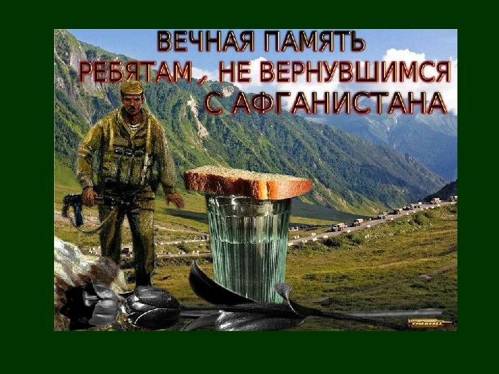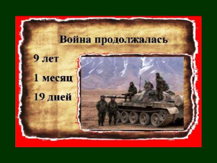 9 лет твоих, Афганистан: декабрь 1979 – февраль 1989 Через Афганистан прошли 600 тысяч военнослужащих. •15053 - погибли или умерли от ран; •49985 - раненных и искалеченных; •330 - пленных и пропавших без вести; •6669 – инвалиды войны