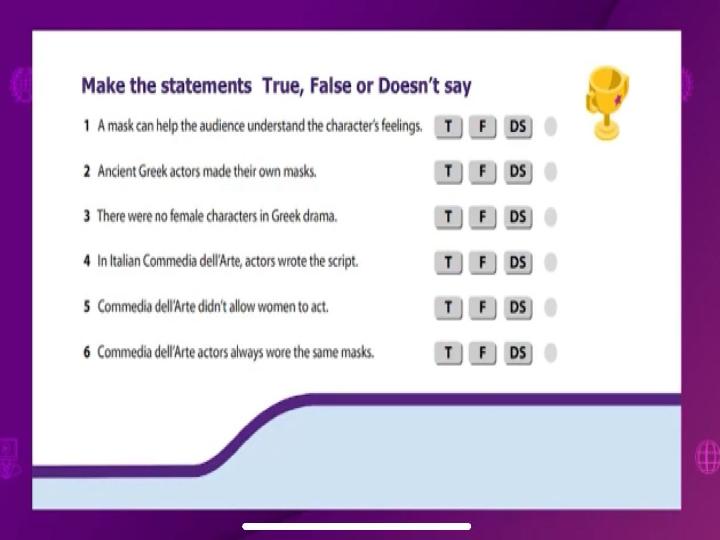 DESCRIPTOR Exercise 1: Mark the sentences T or F. Watch the video - performing the task Total: 2 points