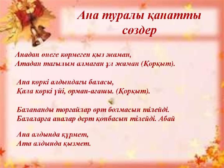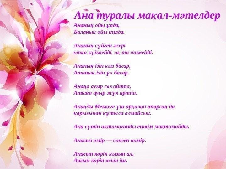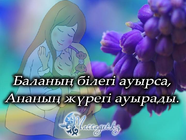 Бала бала, бала деп, Түнде шошып оянған Түн ұйқысын төрт бөліп Түнде бесік таянған. Қолын қатты тигізбей, Кірлі көйлек кигізбей. Иісін жұпар аңқытқан. Бұл кім?