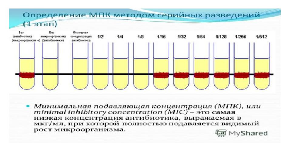 Микроорганизмдердің антибиотиктерге сезімталдығын анықтау әдістері: Сұйық ортада сериялық сұйылту әдісі. Сұйық ортада ( ЕПС ) қолданылатын а/б-тің екі еседен сұйытылған ертінділеріне зерттелетін микробтың бірдей дозаларын қосып шығып, бір тәулік инкубациялағаннан кейін микроб өсіндісі жоқ пробирка бойынша нәтижесін анықтайды. Бұл әдіс бойынша МТК (МПК) және МКБ көрсеткіштерін анықтауға болады.