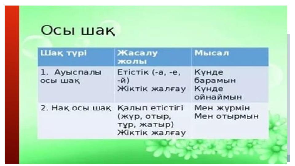 Етістік Нақ осы шақ Ауыспалы осы шақ Оқу Жазу Айту Бару Қайту Жеу