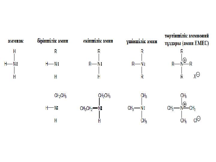 ҚОСЫМША №2 АМИНДЕРДІҢ ТҮРЛЕРІ • Аминдерді бастапқы, екінші және үшінші деңгейге жатқызуға болады. • Аммиакты қарапайым амин деп санауға болады. • Ароматты аминдер де N атомы бензол сақинасына тікелей қосылады. • Төрт іншілік аммоний тұздары құрамында төртінші аммоний ионы бар және аминдермен байланысты, бірақ олар аминдер емес және N -да жалғыз электрон жұбы болмауы керек. • Молекулалар арасында сутектік ( H ) байланыс бар, бірақ бұл спирттерге қарағанда әлсіз (мысалы, CH 3 NH 2 газ). Сутегі атомдарының қаншасының орын алмастырылуына байланысты аминдер әр түрлі түрлерге жіктеледі.