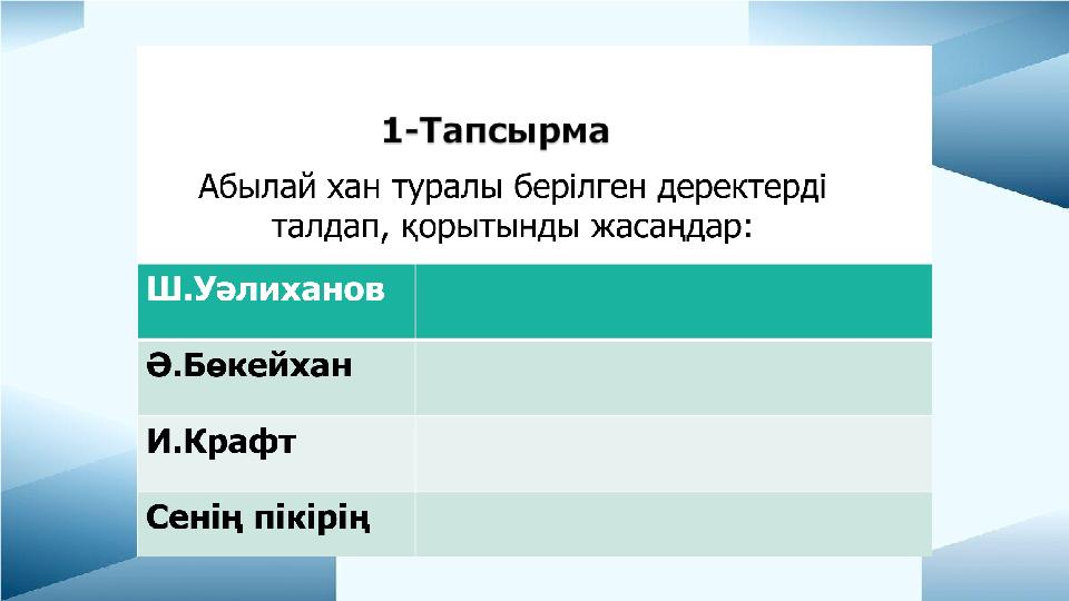 Ашық сұрақтарды қолданудың негізгі әдіс-тәсілдері: «Миға шабуыл» тәсілі: Сабақтың басында тақырып бойынша оқушылардың алдын ала білімін анықтау және қызығушылығын ояту үшін •ХVIII ғасырдың ортасындағы саяси жағдайды талдаңыз. Әбілхайырдың Ресей бодандығын қабылдауының себептері: •а) •b) •Кіші жүздің Ресей бодандығын қабылдауының салдары: •а) • b) Осы тарихи оқиғаға қатысты сіздің көзқарасыңыз қандай?