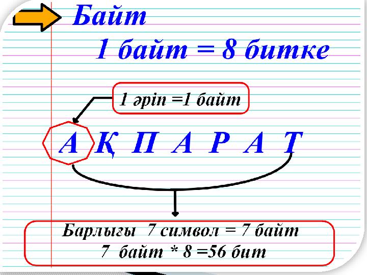 8 бит ____байт 16 бит ____ байт 32 байт ____бит 16 байт ____ бит 24 бит ____ _ байт № 3тапсырма. Ақпаратты өлшем бірліктеріне аударыңыз. Жеке жұмыс