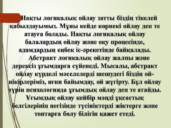 Ойлау түрлері Нақты логикалық ойлау Жинақтай о й лау Индуктивті ойлау Абстракт логикалық ойлау Алгоритмдік ойлау Дедуктивті ойлау