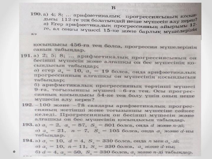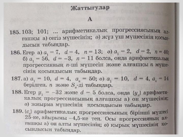 Оқу мақсаттары 9.2.3.4 арифметикалық прогрессияның n- мүшесінің, алғашқы n мүшелерінің қосындысының формулаларын қорытып шығарады және қолданады;
