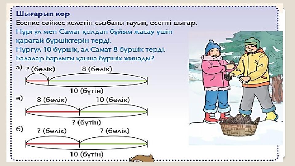Жаңа білімді түсіндіру Белгісіз бүтінді табу үшін оның бөліктерін қосу керек.