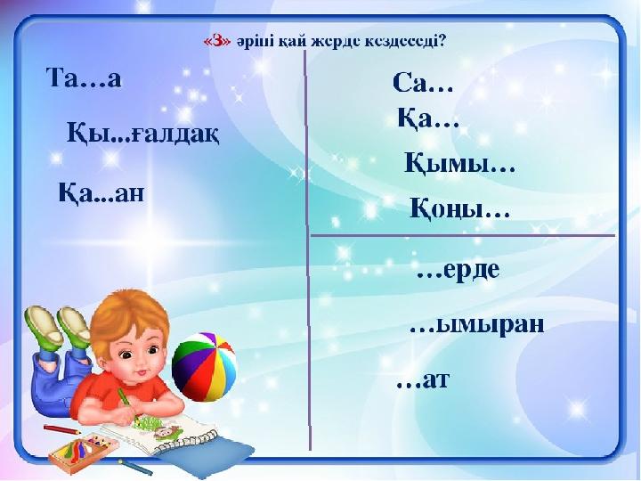 Сабақтың тақырыбы: Зз дыбысы мен әрпі Сабақтың мақсаты: 1. 1. 4. 1 .Мәтіннің мазмұнын тақырыбы немесе оның иллюстрациясы бойынша болжау 1.9 Сөздерді, дыбыстарды орфоэпиялық нормаларға сәйкес дұрыс айту