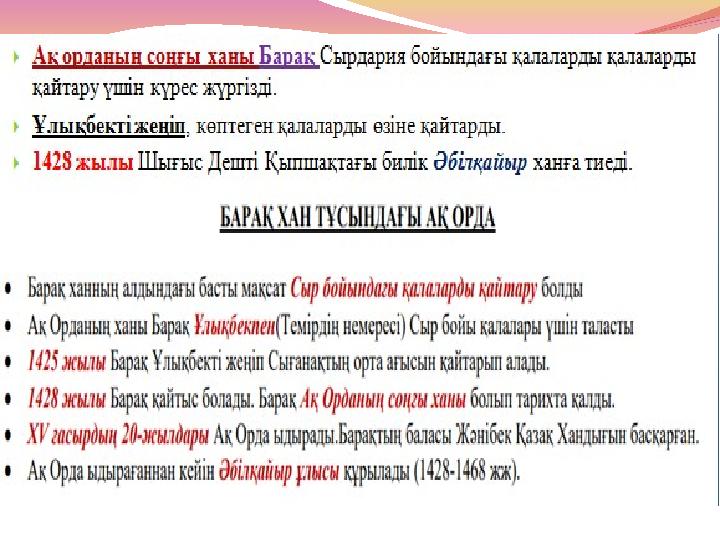 7 сынып Ақ Орда –XIII –XV ғ басында өмір сүрде Орталығы: -Сығанақ қаласы –Сыр өзені бойында Ақ Ордаға –Жетісудан басқа барлық тер.я енді. Мемлекеттің негізін қалаушы : Орда Ежен