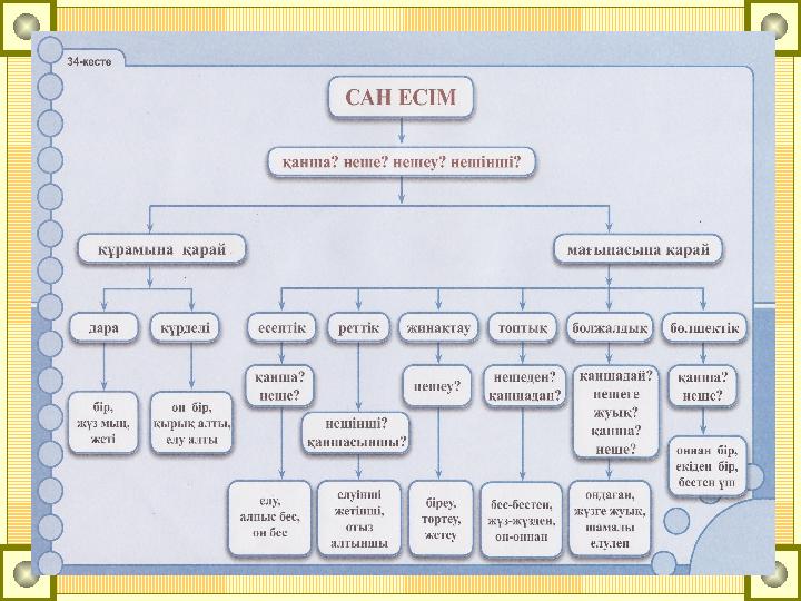 Ережені сызбамен түсіндіру Сан есім Дара сан есімге бір сөзден жасалған сөздер жатады. Мысалы: бір, екі, үш, мың, миллион. Күрделі сан есім екі немесе оден да көп сөздің тіркесінен жасалады. Күрделі сан есімдердің құрамындағы сөздер бөлек-бөлек жазылады. Мысалы: отыз сегіз, без жүз елу бес.