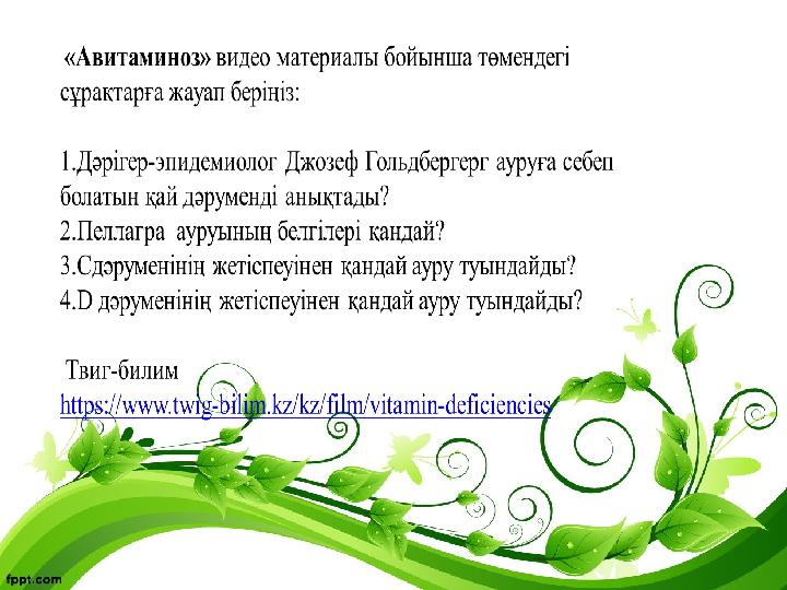 Сұрақтардың жауаптары: 1.Дәрігер-эпидемиолог Джозеф Гольдбергерг ауруға себеп болатын қай дәруменді анықтады? (В3 дәрумені. Ниацин.) 2.Пеллагра ауруының белгілері қандай? (Терінің жойқын бөртуі, күйзеліс және дірілдеу) 3.Сдәруменінің жетіспеуінен қандай ауру туындайды? (цинга ауруы) 4.Д дәруменінің жетіспеуінен қандай ауру туындайды? (мешел ауруы)