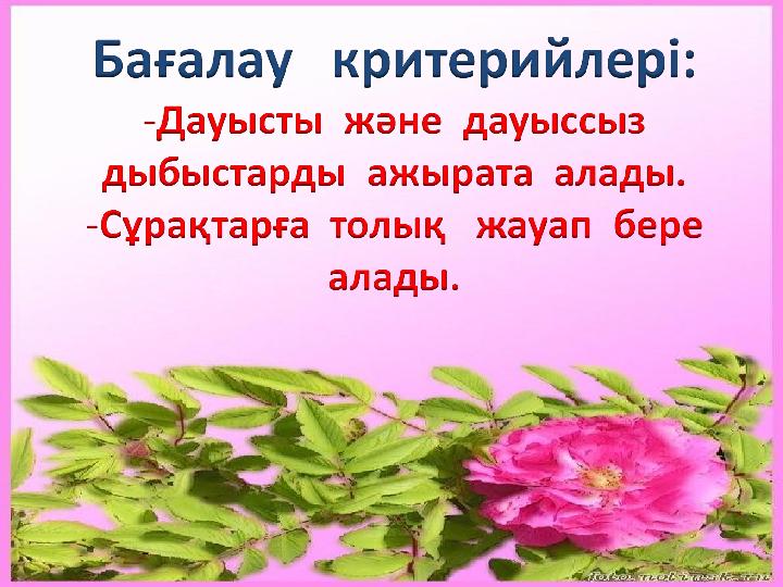 Сабақтың мақсаты: • Тыңдалған мәтінді оқиғаның ретін сақтай отырып баяндау • Сұрақтарға толық жауап беру • Дыбыс түрлерін ажырату және дұрыс дыбыстау