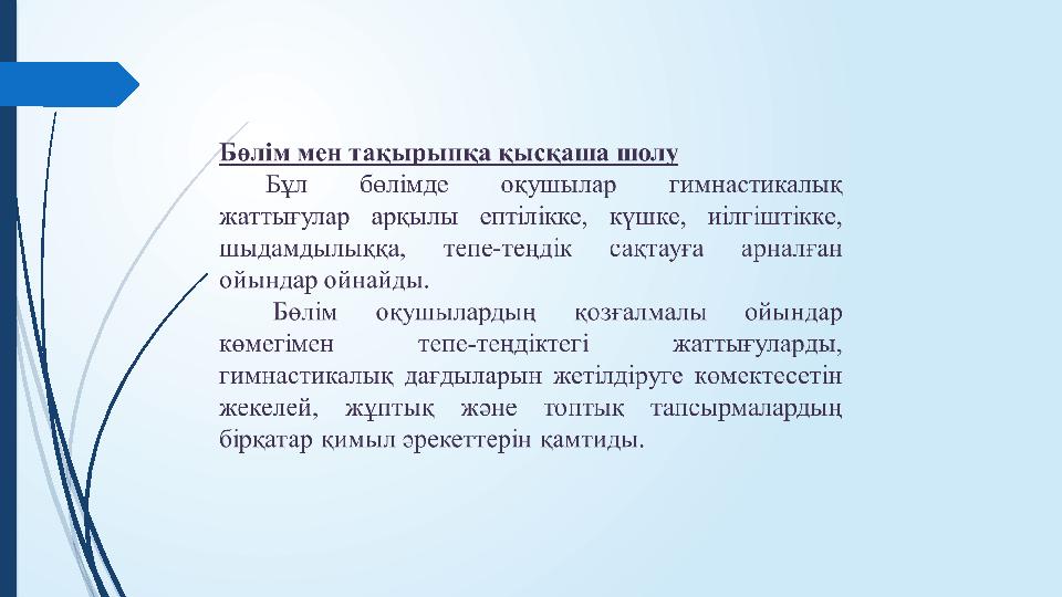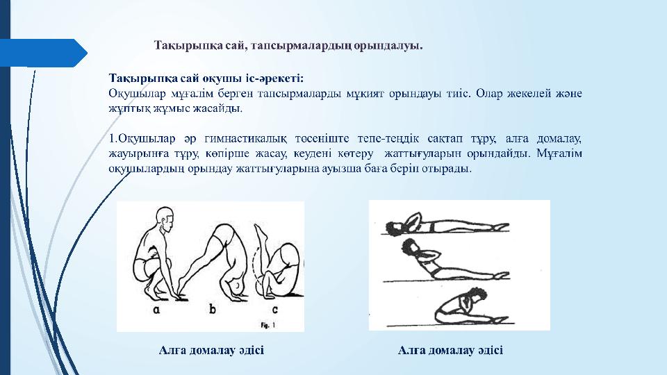 - Оқушылар жатығулардың динамикасын, іс-қимылын