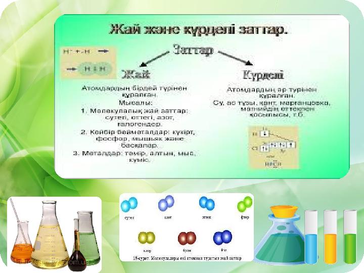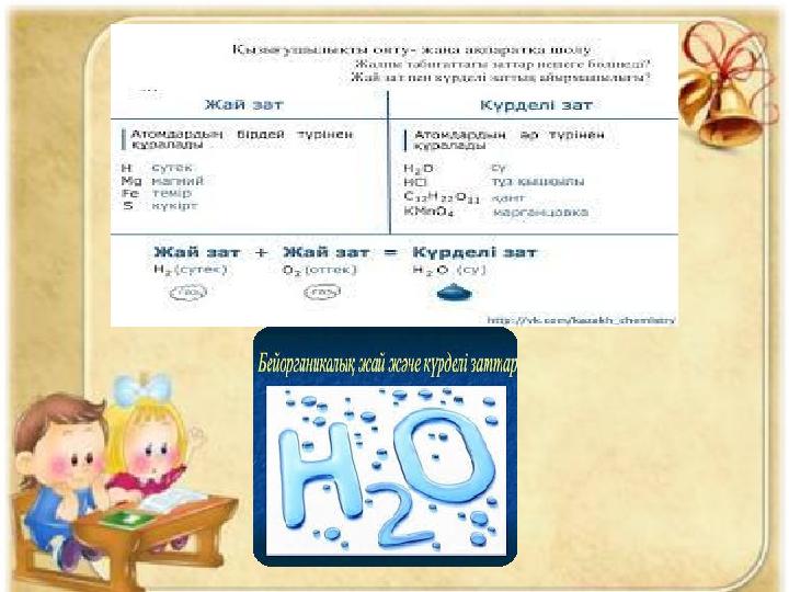 Топтық жұмыс Тапсырма №1 “ Кластер ” әдісі бойынша тақырыптарын қорғау 1 топ “Жай заттар” 2 топ “Күрделі заттар ” Жеке жұмыс Тапсырма №2 № Химиялық Элементтердің атауы Химиялық Элементтердің таңбасы Химиялық элементтер таңбасының оқылуы және қазақша айтылуы Химиялық элементтердің салыстырмалы атомдық массасы 1 Оттек 2 Темір 3 Алтын 4 Күміс 5 Мыс 6 Сынап 7 Сутек Дескриптор 7 элемент үшін екі бағанды дұрыс толтырады - Өмірде өздеріне таныс кейбір металдар мен бейметалдардың қолданылуына мысалдар келтіреді .