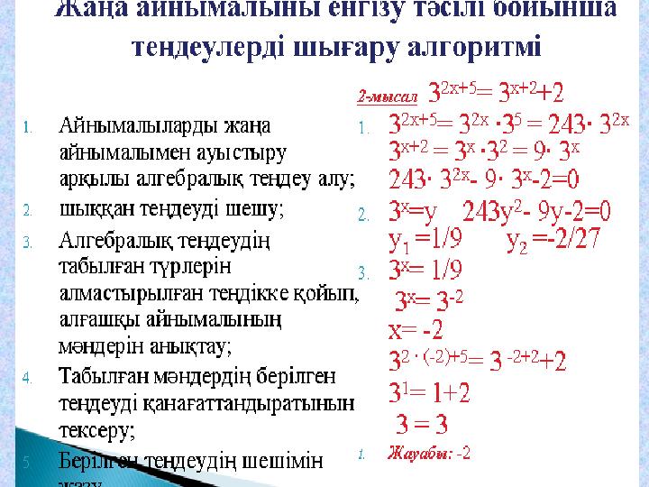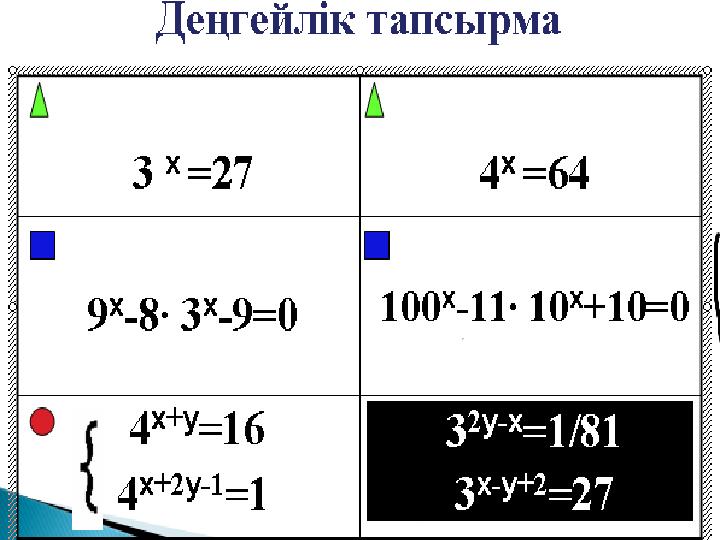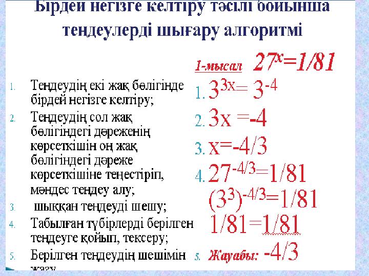 өрсеткіштік теңдеулер және теңдеулер жүйесіКөрсеткіштік теңдеулер және теңдеулер жүйесі Көрсеткіштік теңдеулер және теңдеулер жүйесі11Ә класс Пән мұғалімі: Улыкпанова Г.С 11Ә класс Пән мұғалімі: Улыкпанова Г.С