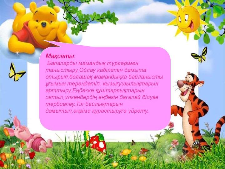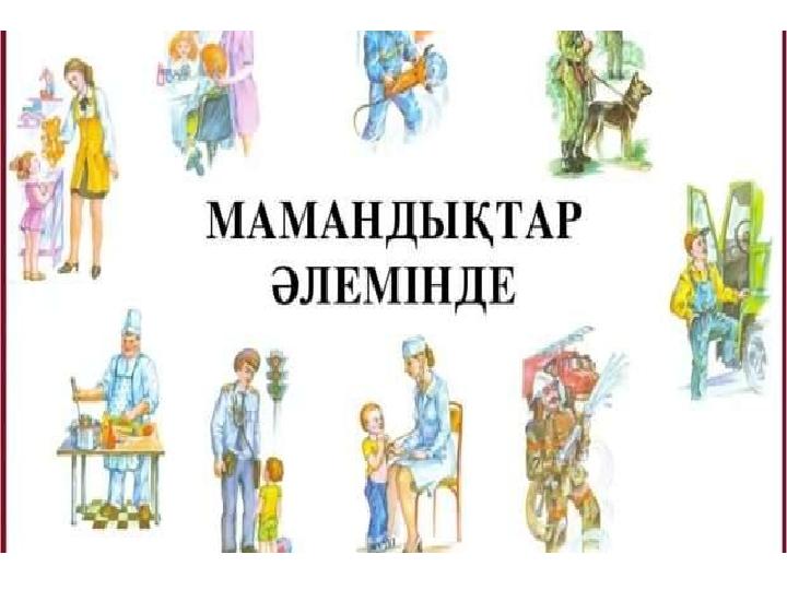 Жарайсыңдар балалар! Міне балалар бұларды мамандық иелері деп айтамыз. Мамандық дегеніміз – адамның еңбек қызметінің түрі. Мамандық таңдау да мектеп қабырғасынан басталады. Әсемпаз болма әрнеге, Өнерпаз болсан әрқалан, Сен де, бір кірпіш дүниеге, Кетігін тапта бар қалан – деп Абай атамыз айтқандай өмірден өз орнын тауып, елімізге қажетті кәсіп иесі болу, әр баланың арманы. Біздің таңдауымыз да, әр түрлі. Біреуін ертен ақын, инженер, құрылысшы, ұстаз т.б мамандық иесі боласыңдар. Жаман мамандық жоқ, мамандықтың бәрі жақсы.