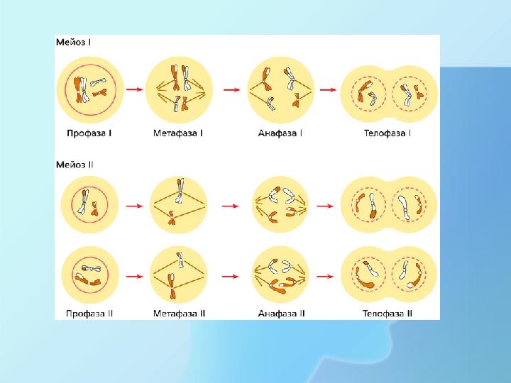 Мейоз сатылары Бірінші мейоз: Профаза-І Метафаза-І Анафаза-І Телофаза-І Екінші мейоз: Профаза-ІІ Метафаза-ІІ Анафаза-ІІ Телофаза-ІІ