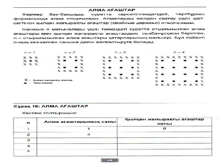 “ ЖИГСО” стратегиясы негізінде топтарға тақырыптарды бөліп бердім Топтық таныстырылымды қорғады «Диалог арқылы сыни ойлауға үйрету » үшін сұрақтар қойылды « Ал тізбектің түрлері қандай? »« Сандар тізбегінің берілу тәсілдері қандай? » “ Шығармашылық жұмыс”«Еркін жазу» стратегиясы бойынша сандар тізбегінің анықтамасын,түрлерін және берілу тәсілдерін жазды Топтық жұмыс жасау арқылы негізгі ойды анықтады“Эротосфен елегі” тәсілімен жай сандар кестесі қалай алынған? Неге “Эротосфен елегі” деп атаған? Тізбекке байланысты К.Ф.Гаусстың өмірінде қандай оқиға болды? Шахмат ең алғаш қай елде дүниеге келді? Тізбекке қатысты шахмат туралы аңыздың мазмұны қандай? Бұл есепте алгебралық тұрғыдан мынадай тақырыптарға келтіруге болады: 1. Бағанды диаграмма 2. Математикалық индукция принциптері 3. Толымсыз квадрат теңдеулерді шешу 4. Статистика мәліметтерді кескіндеу 5. Ықтималдық теорияның элементтері 6. Сандар тізбегі ж әне берілу тәсілдері Бағбаншы алма ағаштарының қатарын көбейтуді ұйғарды. Сонымен қатар алма ағаштарының сыртына қылқан жапырақты ағаштар отырғызды. 1. Нешінші қатарда алма ағашы мен қылқан жапырақты ағаш саны теңеседі? 2. Бағбан қай ағаштың санын көбейткісі келді? Құрастырылған модель арқылы есеп шығару Масштаб тақырыбын еске түсіреміз Периметрін табамыз Үлкен төртбұрыштың ауданын табамыз Кіші тіктөртбұрыштың ауданын табамыз S=S1-S2 Толымсыз квадрат теңдеу мен шешеміз: n(n-8)=0 n>0 n-8=0 n=8 8 қатарда ағаштар саны теңеседі. Статистикалық мәліметтерді бағанды диаграмма (гистограмма ) түрінде көрсетеміз: Қатар Алма ағаша Қылқан ағашы 1 1 8 2 4 16 3 9 24 4 16 32 5 25 40 6 36 48 7 49 56 8 64 64 9 81 72 10 100 80 020406080100120 12345678910 ҚатарАлма ағашыҚылқан ағашы Есептеулердің қорыт ындысы бойынша Бағбан 9 қатардан бастап алма ағашы н қылқан жапыраққа қарағанда көбейткендігін осы диаграммадан көреміз. Процестерді бірлесіп шешіп, нәтижелі өнім алды. PISA есебі