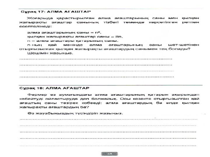 Бұл есепте алгебралық тұрғыдан мынадай тақырыптарға келтіруге болады: 1. Бағанды диаграмма 2. Математикалық индукция принциптері 3. Толымсыз квадрат теңдеулерді шешу 4. Статистика мәліметтерді кескіндеу 5. Ықтималдық теорияның элементтері 6. Сандар тізбегі ж әне берілу тәсілдері Бағбаншы алма ағаштарының қатарын көбейтуді ұйғарды. Сонымен қатар алма ағаштарының сыртына қылқан жапырақты ағаштар отырғызды. 1. Нешінші қатарда алма ағашы мен қылқан жапырақты ағаш саны теңеседі? 2. Бағбан қай ағаштың санын көбейткісі келді? Құрастырылған модель арқылы есеп шығару Масштаб тақырыбын еске түсіреміз Периметрін табамыз Үлкен төртбұрыштың ауданын табамыз Кіші тіктөртбұрыштың ауданын табамыз S=S1-S2 Толымсыз квадрат теңдеу мен шешеміз: n(n-8)=0 n>0 n-8=0 n=8 8 қатарда ағаштар саны теңеседі. Статистикалық мәліметтерді бағанды диаграмма (гистограмма ) түрінде көрсетеміз: Қатар Алма ағаша Қылқан ағашы 1 1 8 2 4 16 3 9 24 4 16 32 5 25 40 6 36 48 7 49 56 8 64 64 9 81 72 10 100 80