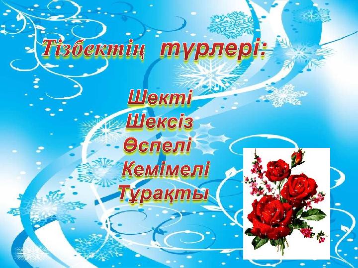 a 1 , a 2 ,a 3 , ......, a n , ...... Бұл жазудың ретін көрсететін натурал сандар ( n= 1,2,3, ... ) функцияның аргументтері немесе тізбектің индекстері ,ал a n аргументке сәйкес функция мәндері немесе тізбектің мүшелері болады. 1 . Анықталу аймағы алғашқы n натурал сандар жиыны болатын функцияны – шекті тізбек деп атайды. Мысалы : Нөлмен аяқталатын бүтін оң екітаңбалы сандар жиыны 10, 20, 30, 40, 50, 60, 70, 80, 90 2.Анықталу аймағы барлық натурал сандар жиыны болатын функцияны – шексіз тізбек деп атайды. Мысалы: Натурал сандар тізбегі 1, 2, 3, 4, 5, ..., n, ... 3 . Тізбектің үлкен индекісіне үлкен мүшелері сәйкес келсе ,ондай тізбектер өспелі тізбек деп аталады. Мысалы: Мүшелері 4-ке еселік болатын сандар тізбегі. 4,8,12,16,20,24, ... 4. Тізбектің үлкен индекісіне кіші мүшелері сәйкес келсе ,ондай тізбектер кемімелі тізбек деп аталады. Мысалы: Натурал сандарға кері сандар тізбегі. 1; 1/2; 1/3; 1/4; ... Өспелі және кемімелі тізбектер бірсарынды (монотонды ) тізбектер деп аталады. 5 . Бір ғана саннан құралған тізбек тұрақты тізбек деп аталады. Мысалы: 2, 2, 2, 2, 2, ..., 2, ...