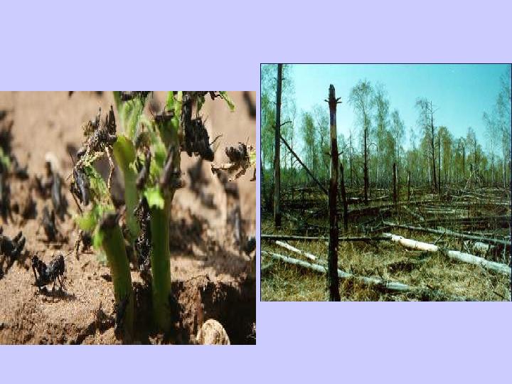 Ормандарды кесу Орманды кесу нәтижесінде аң мен құстан айырылады Ауылшаруашылық зиянкестері- мен күресу үшін егістіктерді, бау- бақшаны, өсімдіктерді жояды Шаруашылық саласында, демалыс кездерінде байқамай өрт шығып, өсімдіктерге зардаптарын тигізеді Қорықтар, ұлттық саябақтар ұйымдастыру