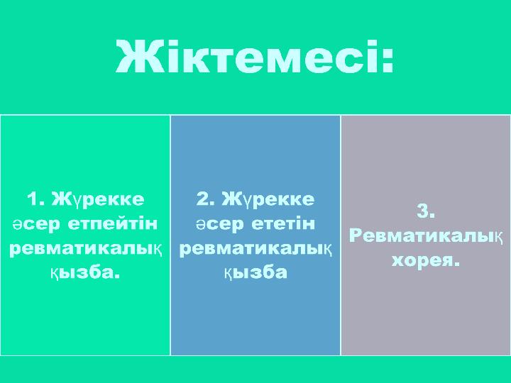 Жоспар • І. Тақырыптың өзектілігі • ІІ. Жедел ревматиздік қызба. • 1. Анықтамасы • 2. Жүректің созылмалы ревматизмдік ауруы. • 3. Жіктелуі • 4.Диогностикалық критери • 5. Клиникалық белгілері мен диагностикасы • 6. Зертханалық – инструменталдық диагностика • 7. Емі • ІІІ. Әдебиеттер