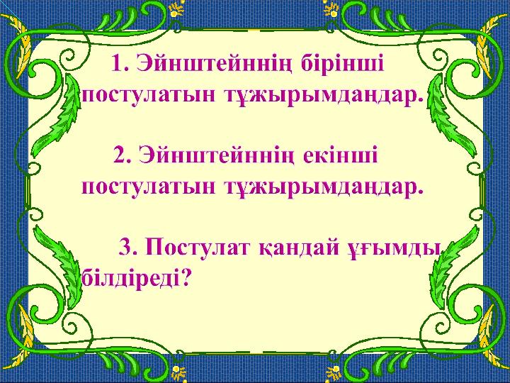 Бірінші постулатЕкінші постулат А. Эйнштейн постулаты Кез келген инерциялық жүйеде барлық физикалық құбылыстар ( тек механикалық қана емес) бірдей жағдайларда бірдей өтеді, яғни таңдап алынған инерциялық санақ жүйесіне қатысты физикалық заңдар инварианты.ВВпап Вакуумдегі жарық жылдамдығы жарық көзінің жылдамдығына да жарықты қабылдаушының жылдамдығына да тәуелсіз. Ол барлық бағытта және барлық инерциялық санақ жүйелерінде бірдей, табиғаттағы ең үлкен шекті жылдамдық.