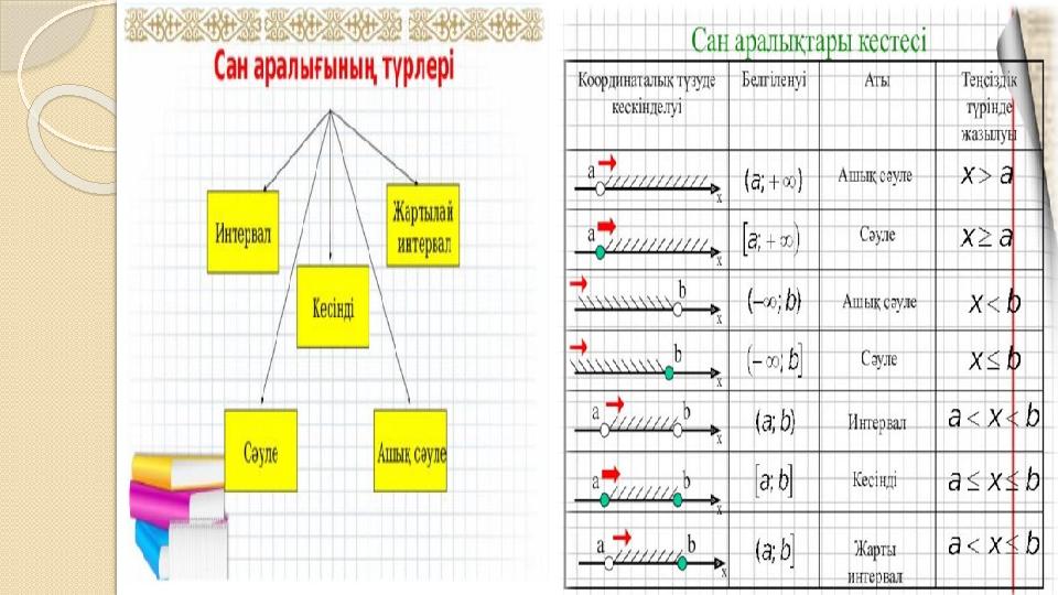 1)Минус шексіздіктен плюс шексіздікке дейінгі сан аралығы 2)Минус шексіздіктен екіге дейінгі, екіні қоса алғандағы сан аралығы 3) Бестен плюс шексіздікке дейінгі, бесті қоса алғандағы санды сәуле 4)Бірден плюс шексіздікке дейінгі ашық сәуле 5) Минус үштен бірге дейінгі санды кесінді 6) Минус үштен үшке дейінгі сан аралығы 7) Он бестен плюс шексіздікке дейінгі санды сәуле 8) Минус бестен беске дейінгі, минус беспен бесті қоса алғандағы сан аралығы 9) Нөлмен беске дейінгі санды интервал