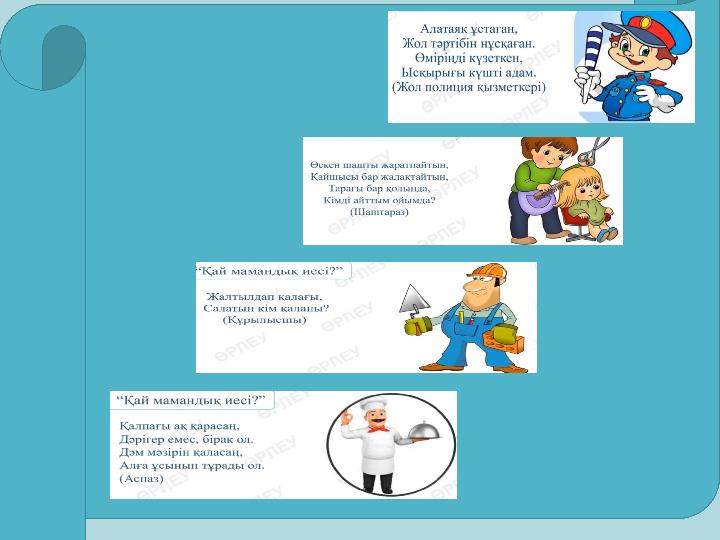 Тыңдайық, қане, ойлайық, Білімге терең бойлайық. Оқыған маман шын маман, Мамандық алмай қоймайық.
