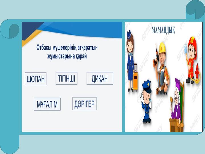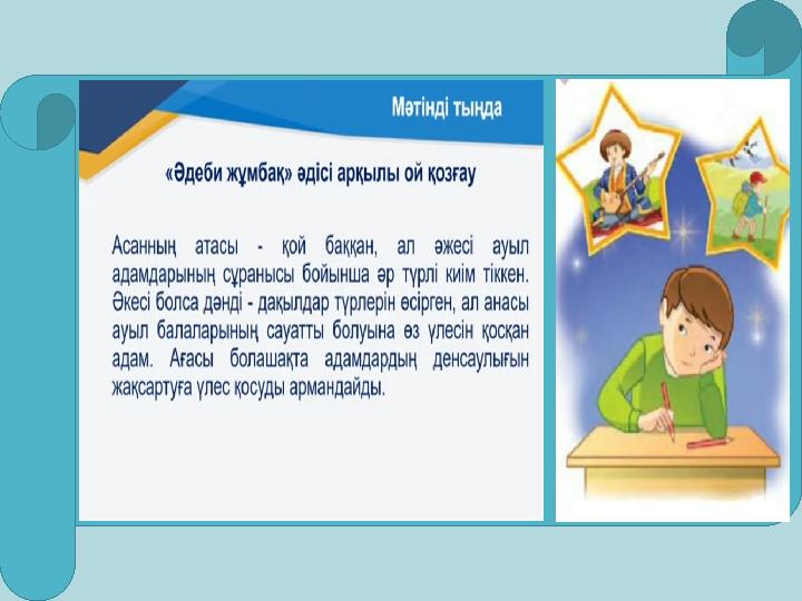 Белсенді оқу тапсырмалары : Әдісі: « Галлереяда ой шарлау» Қажет ақпаратты тауып, оқы 1. Өлеңде қандай мамандық туралы айтылған? 2. Өлеңдегі басты кейіпкерлер кімдер? 3. Әкесінің «Кім болсаңда өзің біл» деген сөзін қалай түсіндің? 4. Әкесінің баласына айтқан ойларының қайсысы маңызды деп ойлайсың? 5. Өлеңнің тақырыбы мен негізгі ойын білдіретін сөз қайсысы деп ойлайсың және өлеңнің қай шумағында жазылған? 6. Сен өскенде кім болғың келеді?