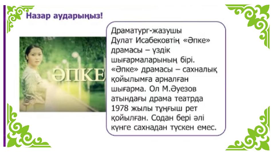 Ашық сабақ тақырыбы: Дулат Исабеков "Әпке" драмасы