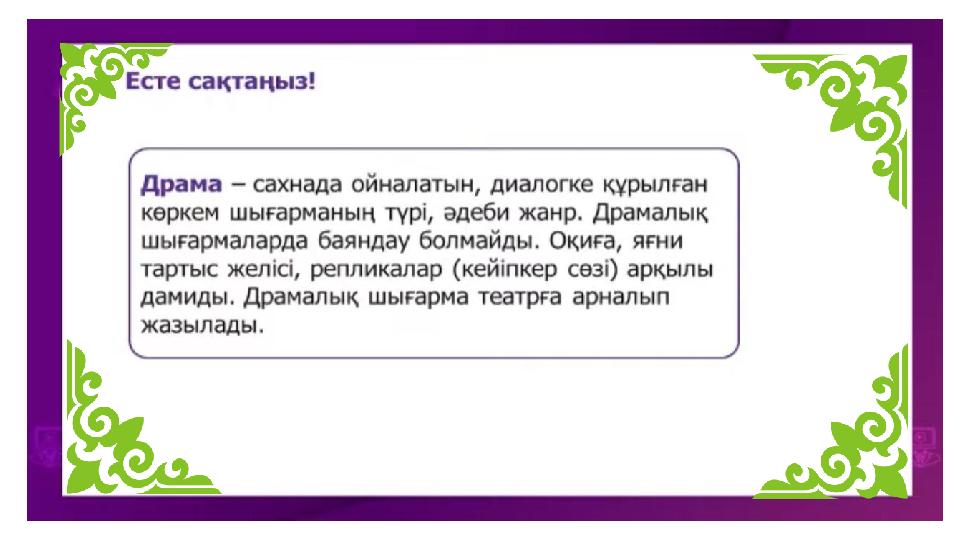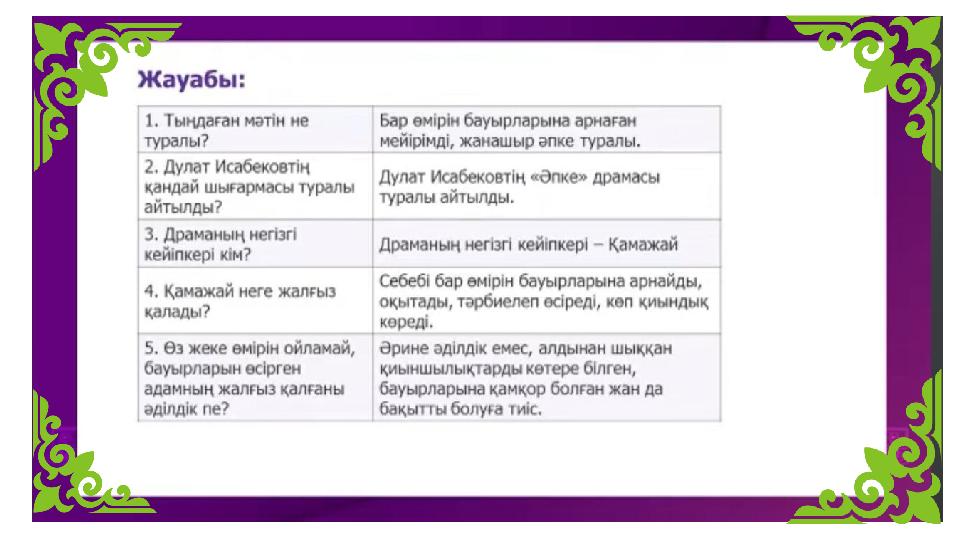 “Ізденіс стратегиясы” Әпке драмасындағы кейіпкерлерді тауып, дәптерге жазу Қамажай - басты кейіпкер. Омардың, Темірбек пен Ермектің әпкесі. Мінезі жағынан қамқор, қарапайым,бауырмал, әрі мейірімді кейіпкер. Омар - Қамажайдың інісі. Мамандығы жағынан ғалым, философ, көбіне ғылыми тілде сөйлейді, бірак жаны ізгі жандардын бірі, сыпайы, адамгершілігі мол, көзілдірік тағады, бойын ашуга билетпейді, көп сөйлегенді ұнатпайды, білімді, жаны ғылымды сүйеді, лақап аты -Ом. Темірбек (Тимур) - Камажайдың інісі. КамА3-да бригадир болып жұмыс істейді. Тік мінезді, бұрама тілді, бірак адал, қызу қанды, дөрекі, айналадағыларына қамқор. Ермек - Камажайдын інісі. Оте сүйкімді кейіпкер. үйінін кенжесі. Назила - Камажайдын сінлісі. Мұғалім болып жұмыс істейді. Мінезі - ерке, тікмінезді, тура сөзді. Гaуhap - Назиланың құрбысы. Омарға ғашык. Ойын көтеретін ақкөніл, адамгершілігі мол жан. Кәмила (Кама) - Темірбектің сүйген қызы, кейіннен әйелі, темекі тартады, тілінің уы бар қыз. Өте өжет жан, жүрген жерінде ұрыс-керіске ұшырап жағымсыз кейіпкер ретінде көрінеді. Сұлтан - Темірбектің (Тимур) досы. Білімді, зерек, сыпайы, сөзі құлаққа жағымды. Сұлухан (Светлана) - Сұлтанның жанындағы қыз. Қабен - өте ақылды адам. Бақытқа ұмтылған жан. Көрші әйел - Адам жанын түсіне білетін,жаны ашып көмектесуге дайын тұратын жағымды кейіпкер.