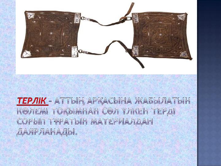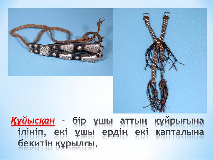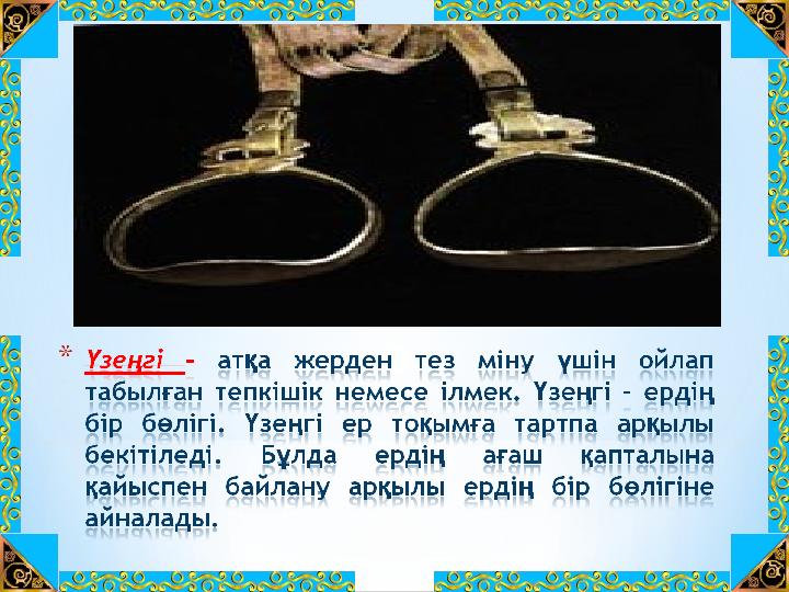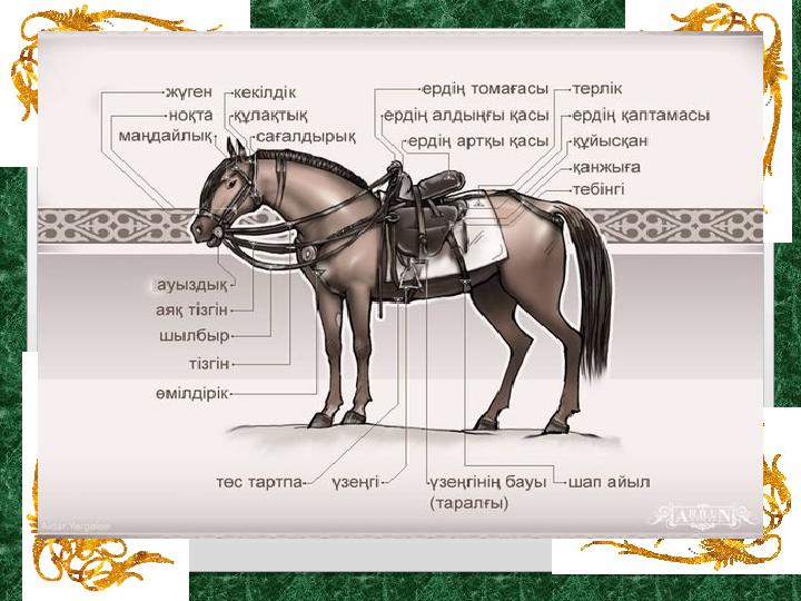 Айыл – Айыл – ердің ағаш қаңқасына ердің ағаш қаңқасына бекітілген қайыстан жасалған бекітілген қайыстан жасалған құрамдас бөліктері. Ердің құрамдас бөліктері. Ердің қапталының артқы жағына байланған қапталының артқы жағына байланған бау. бау.