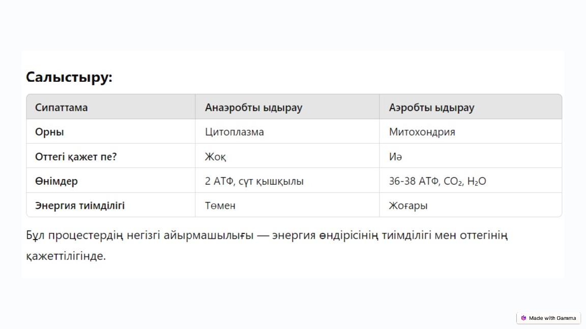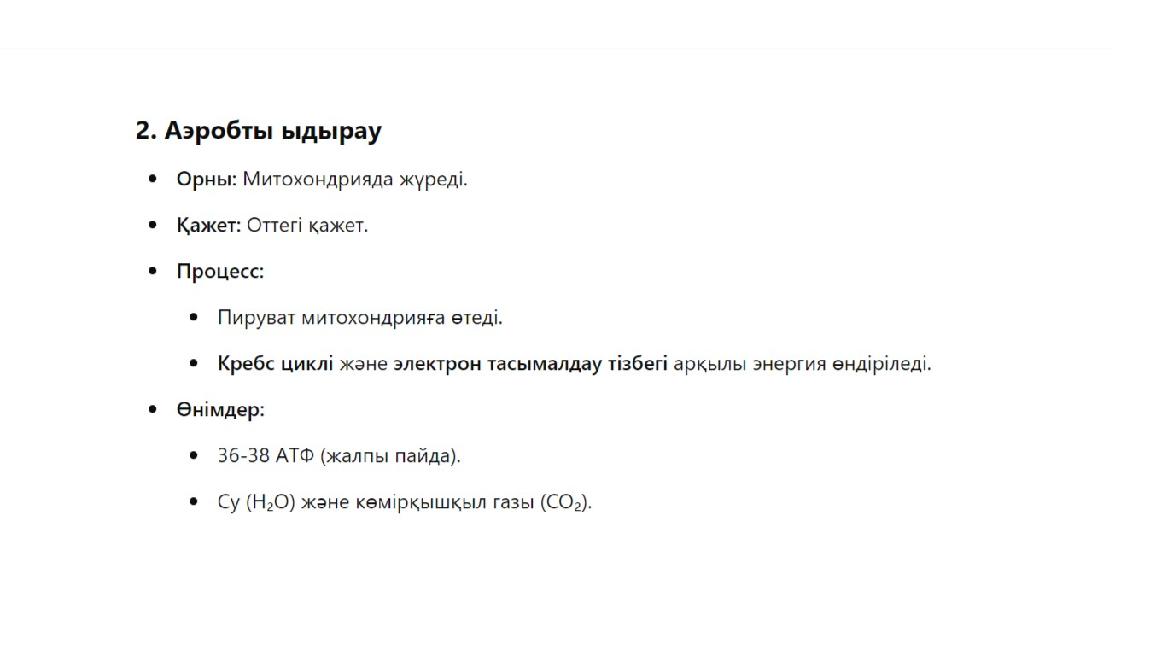 Анаэробты глюкоза ыдырауы: гликолиз 1Глюкоза ыдырауының бастапқы сатысы Гликолиз глюкозаны пируваттарға дейін ыдырату процесі. 2АТФ өндіру Гликолиз арқылы шамамен 2 АТФ молекуласы түзіледі. 3Анаэробты жолы Оттегісіз ортада гликолиз жүреді, нәтижесінде лактат пайда болады. 4Энергия тапшылығы Гликолиз АТФ өндіреді, бірақ ол аэробты ыдырауға қарағанда аз.